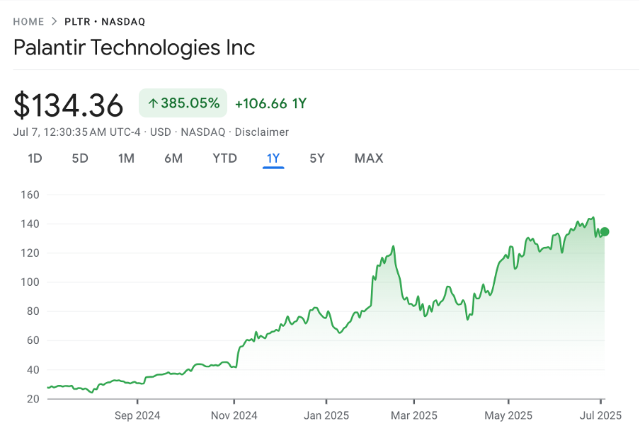 For instance, Palantir is up 385% in the past 12 months.