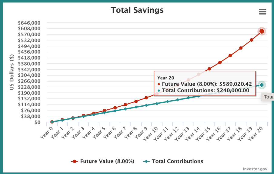 If one invests $1,000 a month for 20 years, their total contributions would be $240K. At 8% average interest rate, the total portfolio balance would reach $589K.