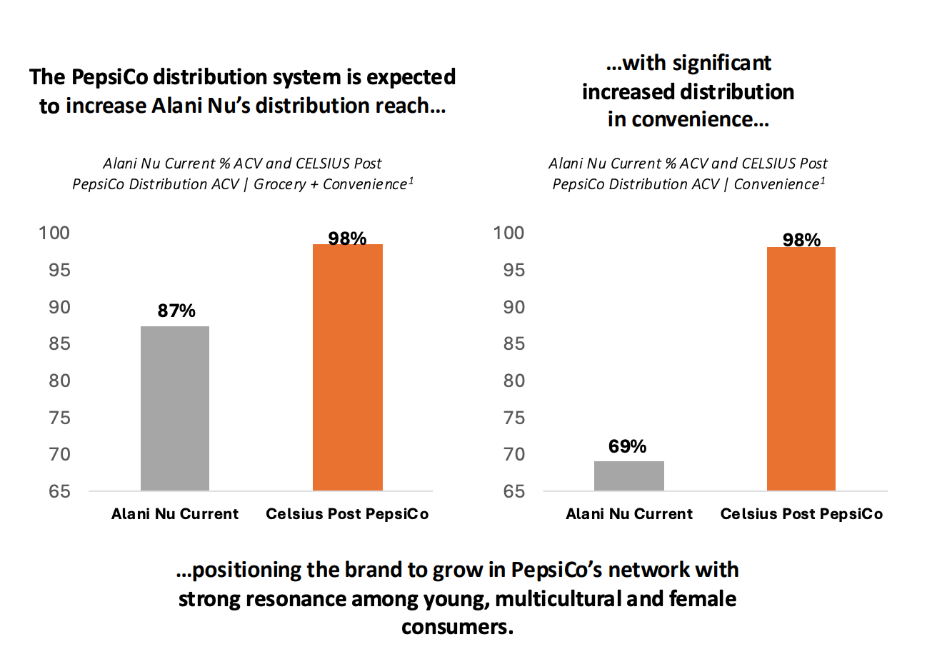 Essentially, this means that Celsius will be able to decide how each brand is promoted within Pepsi’s distribution system. Celsius, Alani, and Rockstar each have different brand positionings, so being able to adjust distribution, placement, and promotional strategies will enable Celsius to increase sales. At the same time, the company will use Pepi’s distribution network and logistics to push brands to more stores in a cost-effective way.
