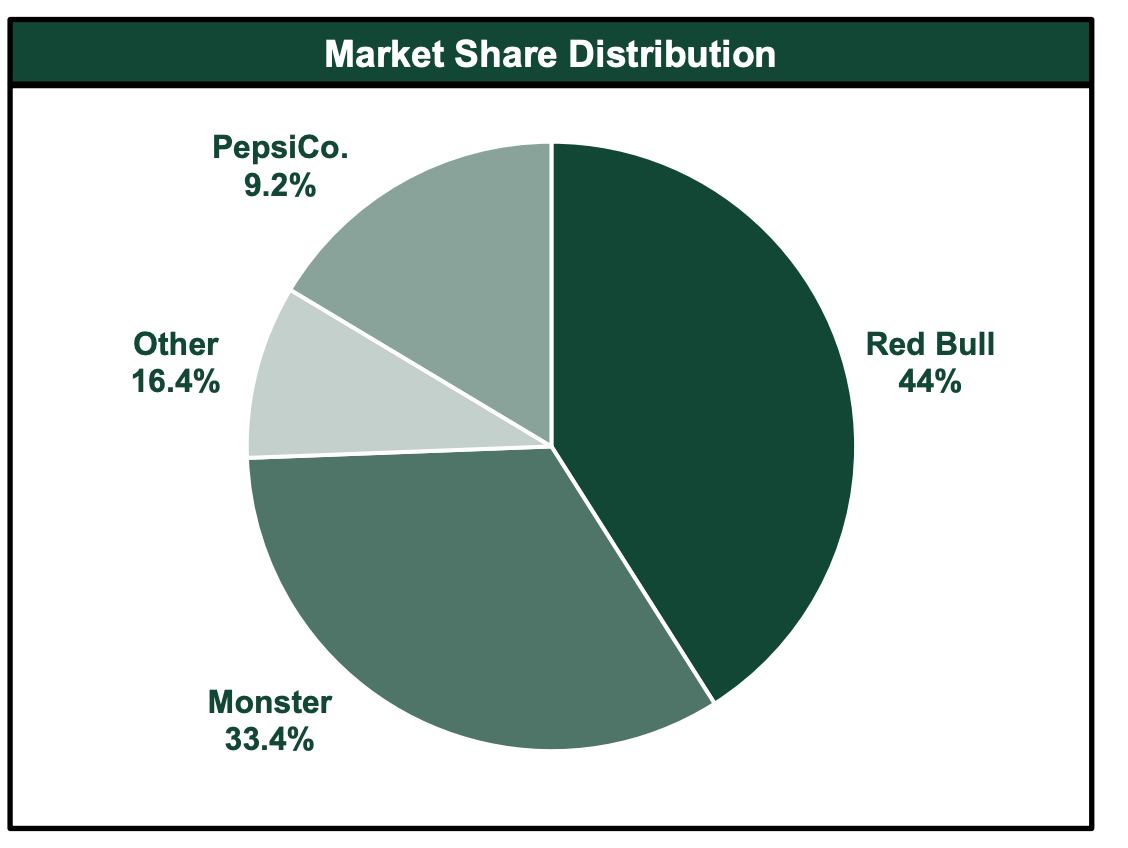 The above pie chart shows the 2020 US energy drink market share distribution from Oregon Consulting Group. According to them, Pepsi had an estimated 9.2% market share, primarily stemming from Rockstar.