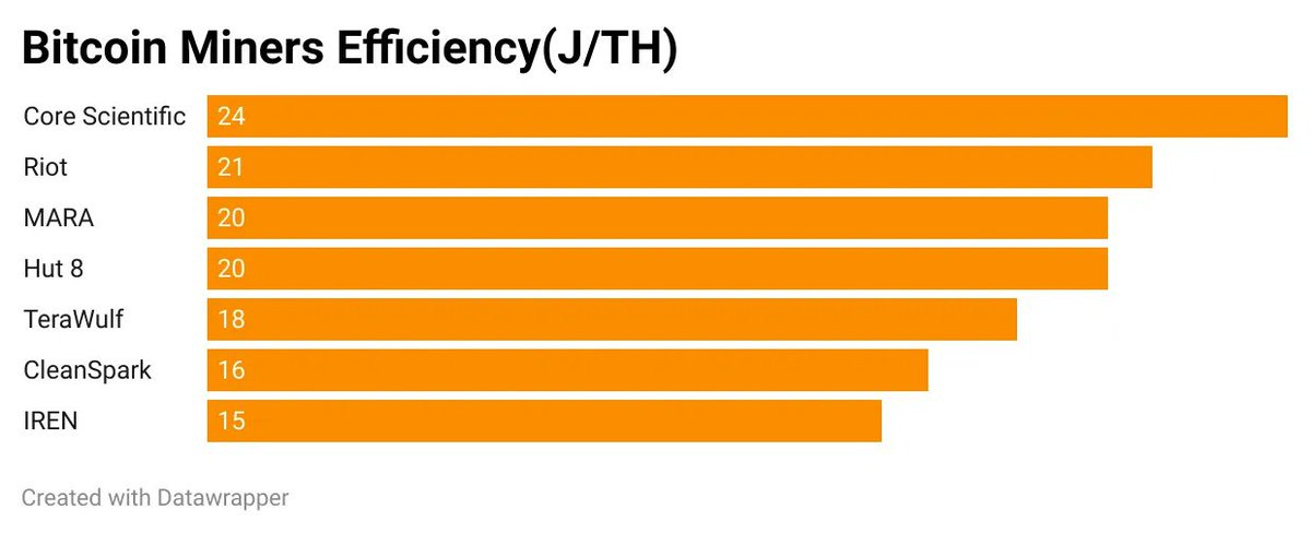 In the picture above, we can see the efficiency of the leading Bitcoin miners. Iren is the most efficient with 15 J/TH, while most of the others use around 20 J/TH.