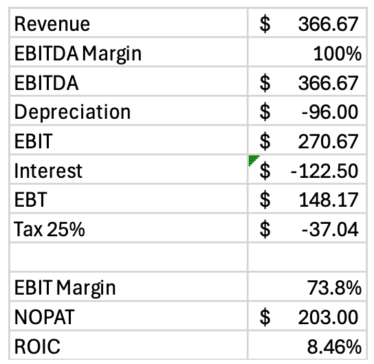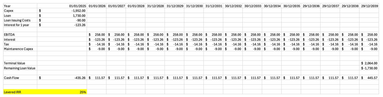 Modelling a 86% EBITDA margin, 25 year, 88% loan to cost loan at 7.125% interest rate that gets refinanced every 5 years, 3% maintenance capex, and an 8x EBITDA multiple to calculate terminal value.