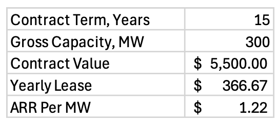A $5.5B deal might seem large, but it only amounts to $366.67M per year on average. Furthermore, the agreement is for 300MW of gross capacity, implying an ARR of $1.2M per gross MW, which is quite low.