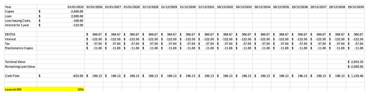 Modelling a 25 year, 83% loan to cost loan at 6.125% interest rate that gets refinanced every 5 years, 3% maintenance capex, and an 8x EBITDA multiple to calculate terminal value, I get a levered IRR of 32%.