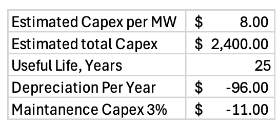 Therefore, the cost per gross MW is around $6-8M, so let’s model $8M.