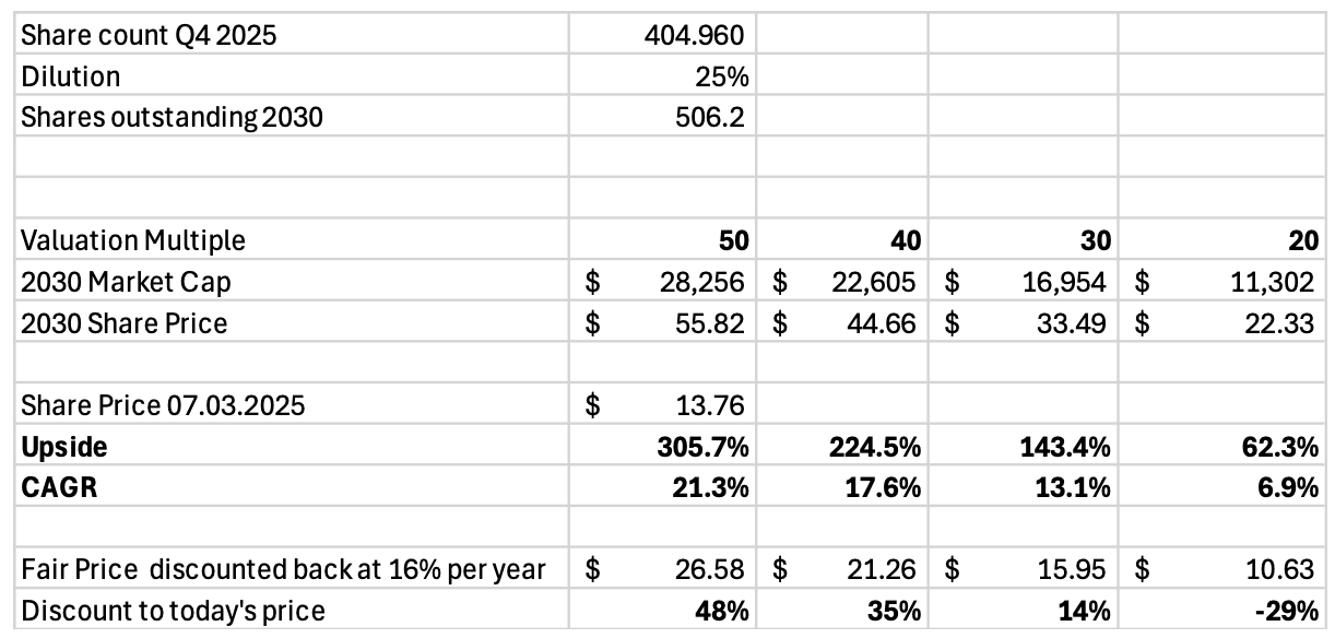 Furthermore, if the market assigns a higher multiple of 40-50, the upside increases to 225-306%. The multiple depends on the company’s execution and growth outlook past 2030.