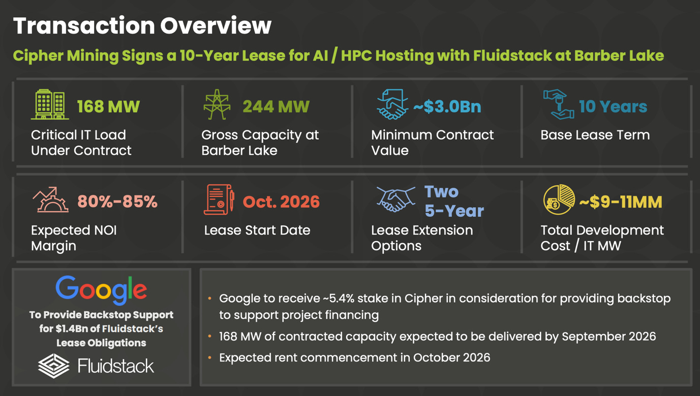 On September 25, 2025, CIFR signed a 10-year $3B colocation agreement with Fluidstack, which is backed by Google.