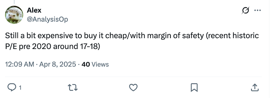 I think Apple is one of those companies that could be perfectly situated to fall 50% in the next few years. I can already see X/Twitter posts in 2028 claiming that because Apple trades for a P/E of 20, below the 2025 P/E of 31, it is a great buy.