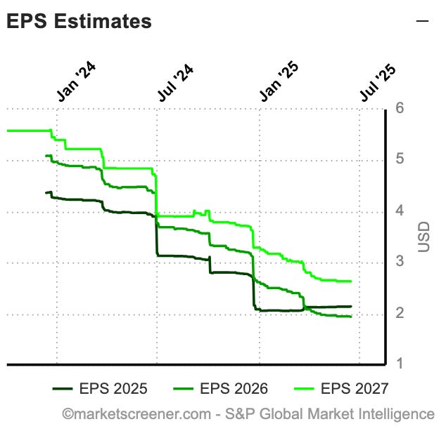 This is while the company grew sales by 0.4% in 2024, and analysts expect 0% sales growth this year and just 3% in 2026.