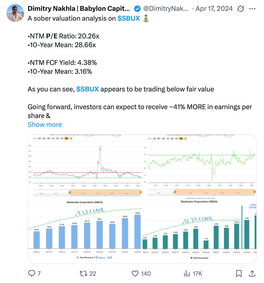 In the above X/Twitter post, Dimitry implies that Starbucks is undervalued, largely because when he made the post, it traded for a FWD P/E of 20, below the 10-year mean of 28.6.