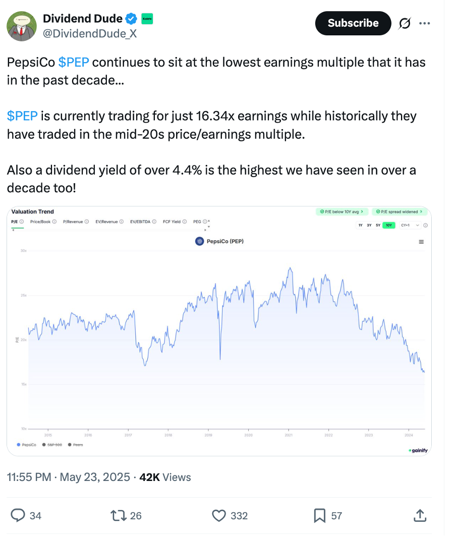 In the above X/Twitter post, Dividend Dude is implying that because Pepsi trades for a P/E of 16, significantly below historical averages of 25+, it is a buying opportunity.