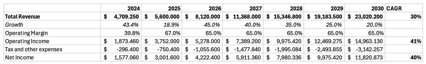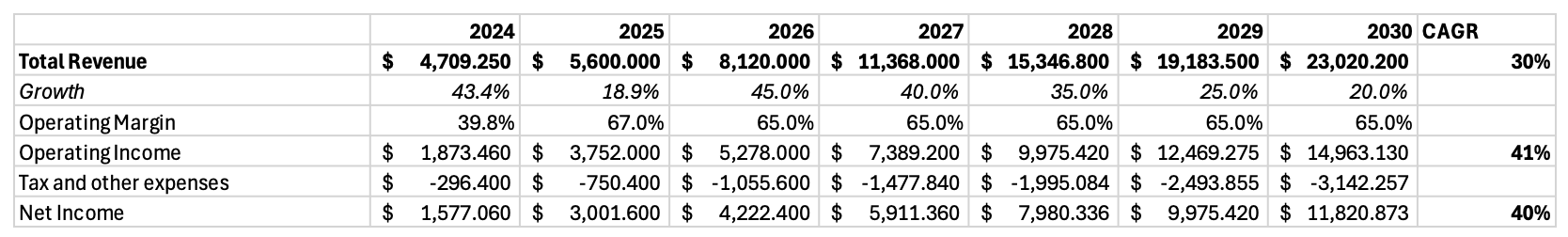 I don’t believe that this is sustainable, and I think they may need some more expenses to sustain the 30% revenue CAGR, so I model an operating margin of 65%.