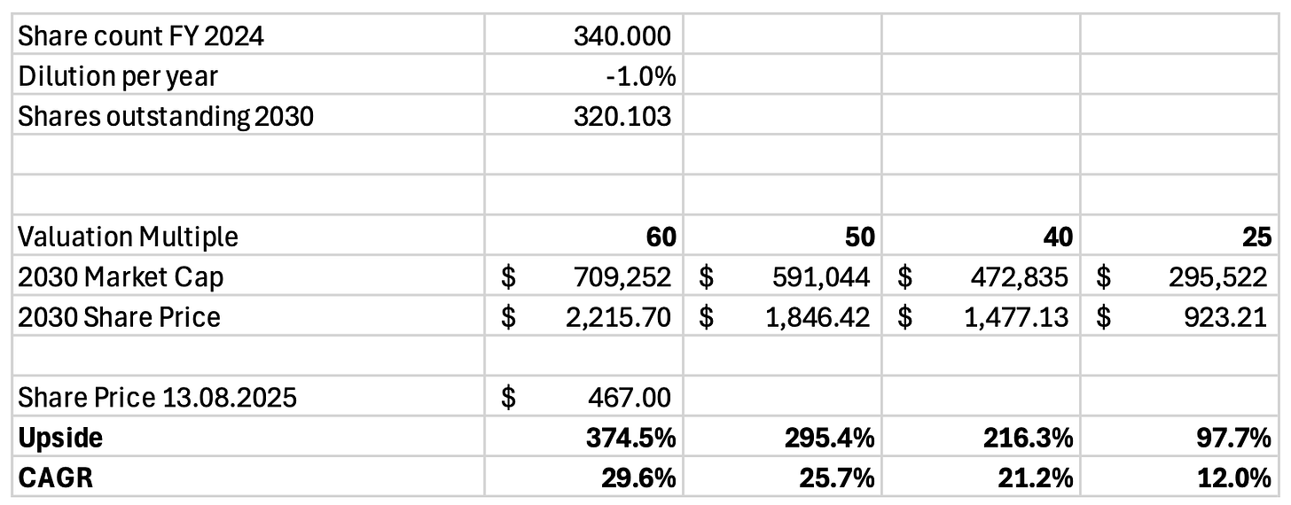Furthermore, as an extremely profitable company, I expect them to continue repurchasing shares, thus, I model a negative 1% dilution per year.