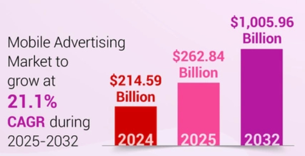 Analysts at Fortune Business Insights forecast that the global mobile advertising market will grow with a stunning 21.1% CAGR till 2032, reaching $1T!