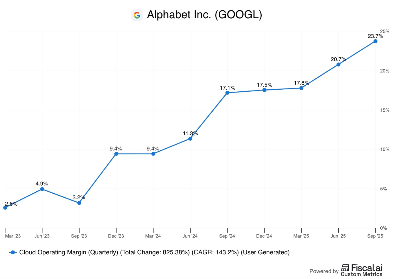 Cloud operating margin now sits at 23.7%, a noticeable improvement from 20.7% in Q2 2025 and 17.1% in Q3 2024. While there is still room for margins to grow, as the deceleration from 141% Y/Y growth to 84.6% shows, it won’t be as easy to increase them anymore, and growth will be more gradual.