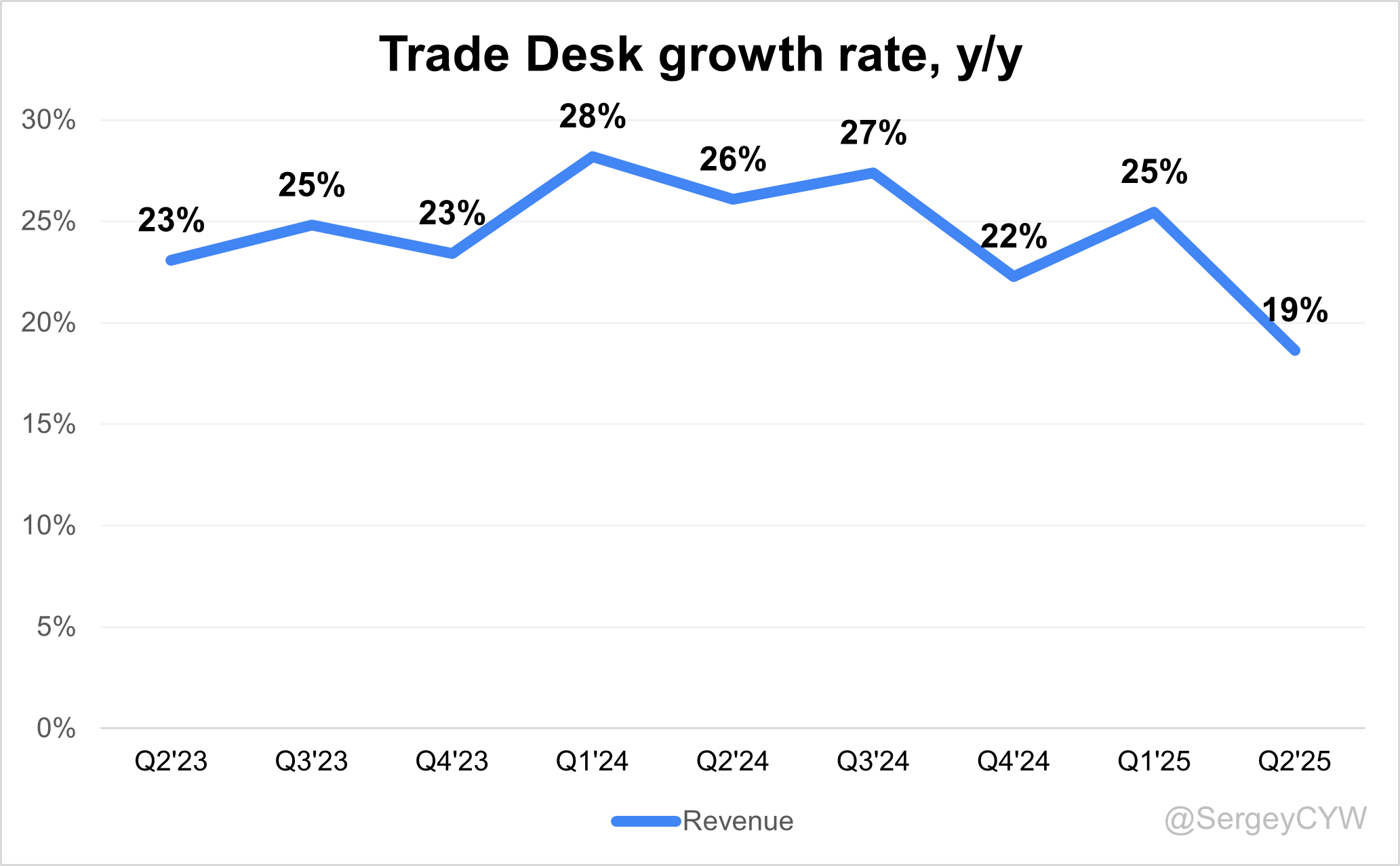 $TTD’s revenue growth slowed significantly from +25.5% YoY last quarter to +18.6% in Q2 2025. The revenue beat in Q2 was only 1.8%. If the company beats its forecast by 1.8% again, Q3 growth would be just 16.2%, indicating further deceleration in revenue growth.