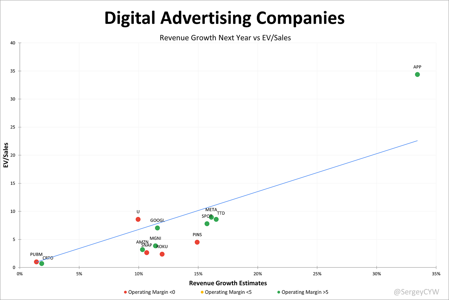 Analysts forecast $TTD’s revenue growth at +18.2% for 2025 and +16.5% for 2026. Based on these projections, The Trade Desk appears undervalued on an EV/Sales basis relative to other digital advertising companies. It’s also worth noting that analysts’ revenue growth forecast for The Trade Desk is among the highest in digital advertising, second only to $APP.