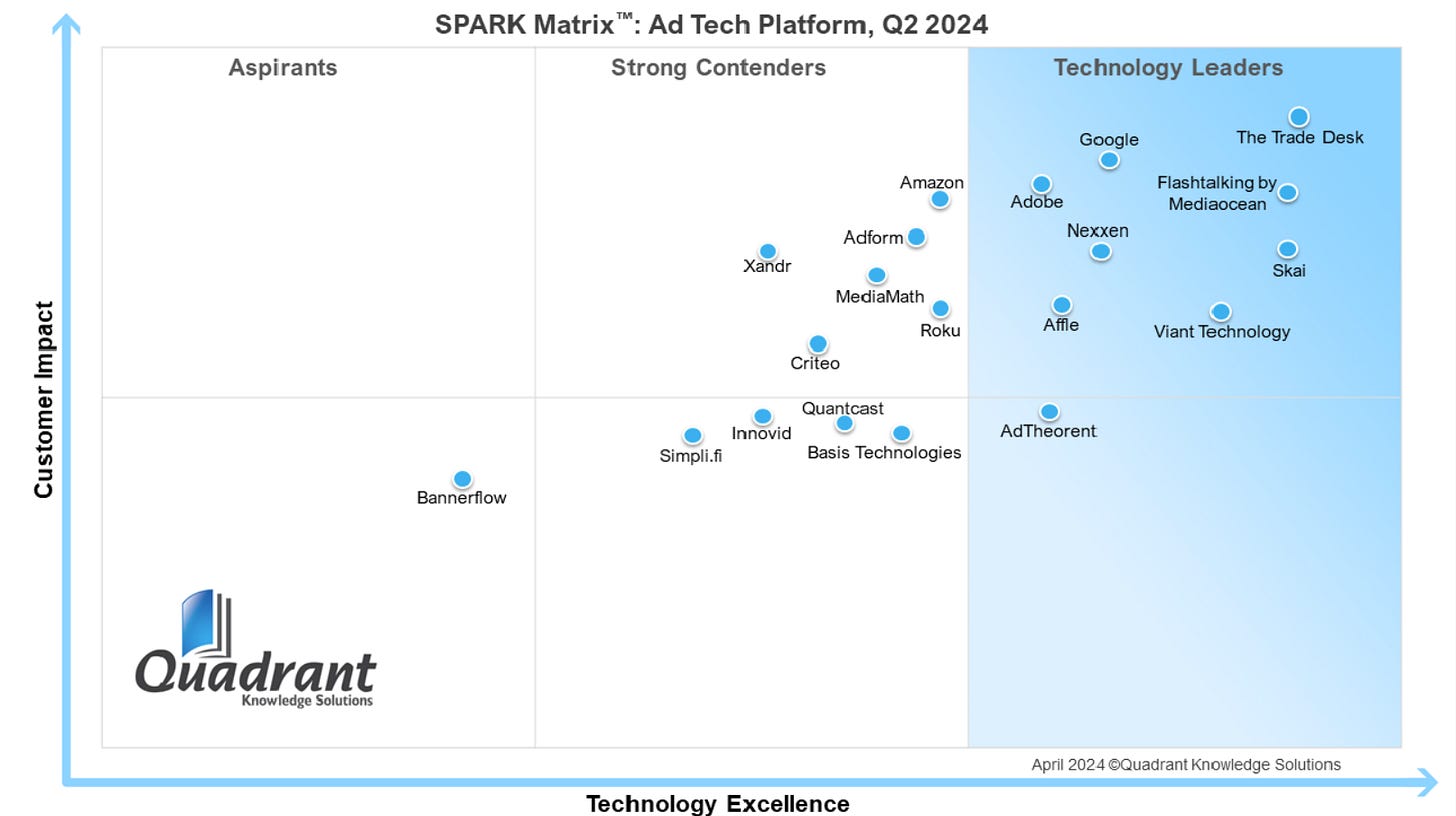 In 2024, The Trade Desk was also named a leader in the Quadrant Knowledge Solutions SPARK Matrix for Ad Tech, ranking highest in both technology excellence and customer impact. The evaluation covered 20 AdTech companies, positioning The Trade Desk alongside top-tier players such as Adobe, Google, and Flashtalking.