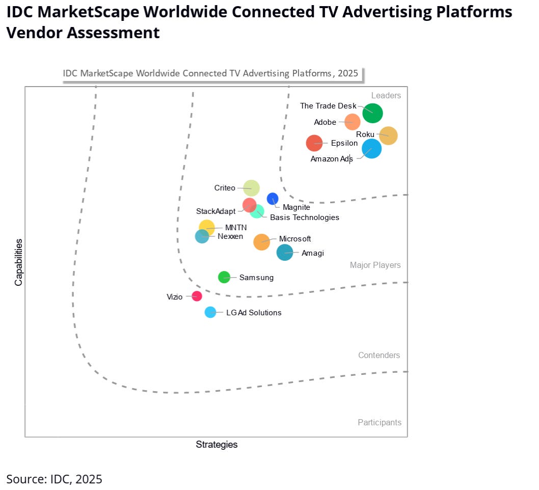 IDC positioned The Trade Desk in the Leaders category in its 2025 IDC MarketScape: Worldwide Connected TV Advertising Platforms Vendor Assessment. The company earned the highest score in Capabilities among all evaluated vendors, demonstrating technical superiority in the CTV advertising space.