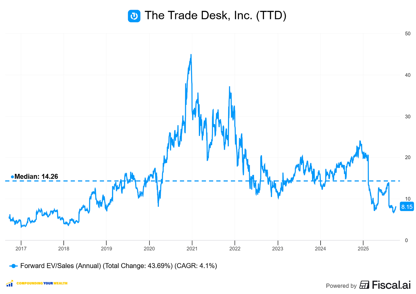 $TTD The Trade Desk is currently trading at a forward EV/Sales multiple of 8.1, which is below its median of 14.2. As of January 2023, it is also near the lows seen between 2019 and 2024.