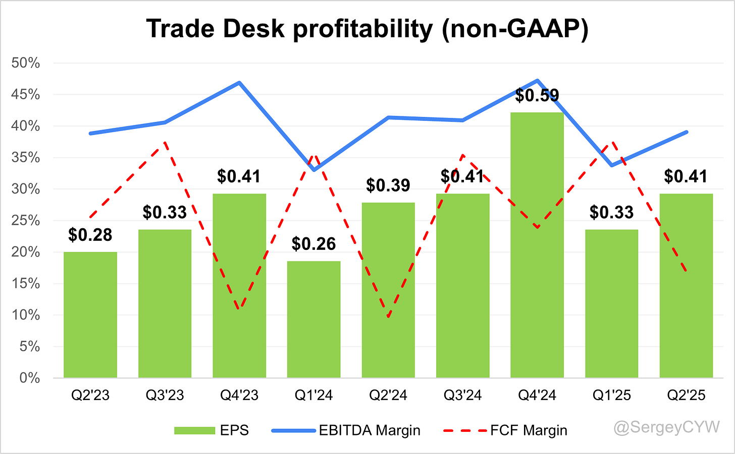 Over the past year, $TTD has seen changes in its margins and profitability: