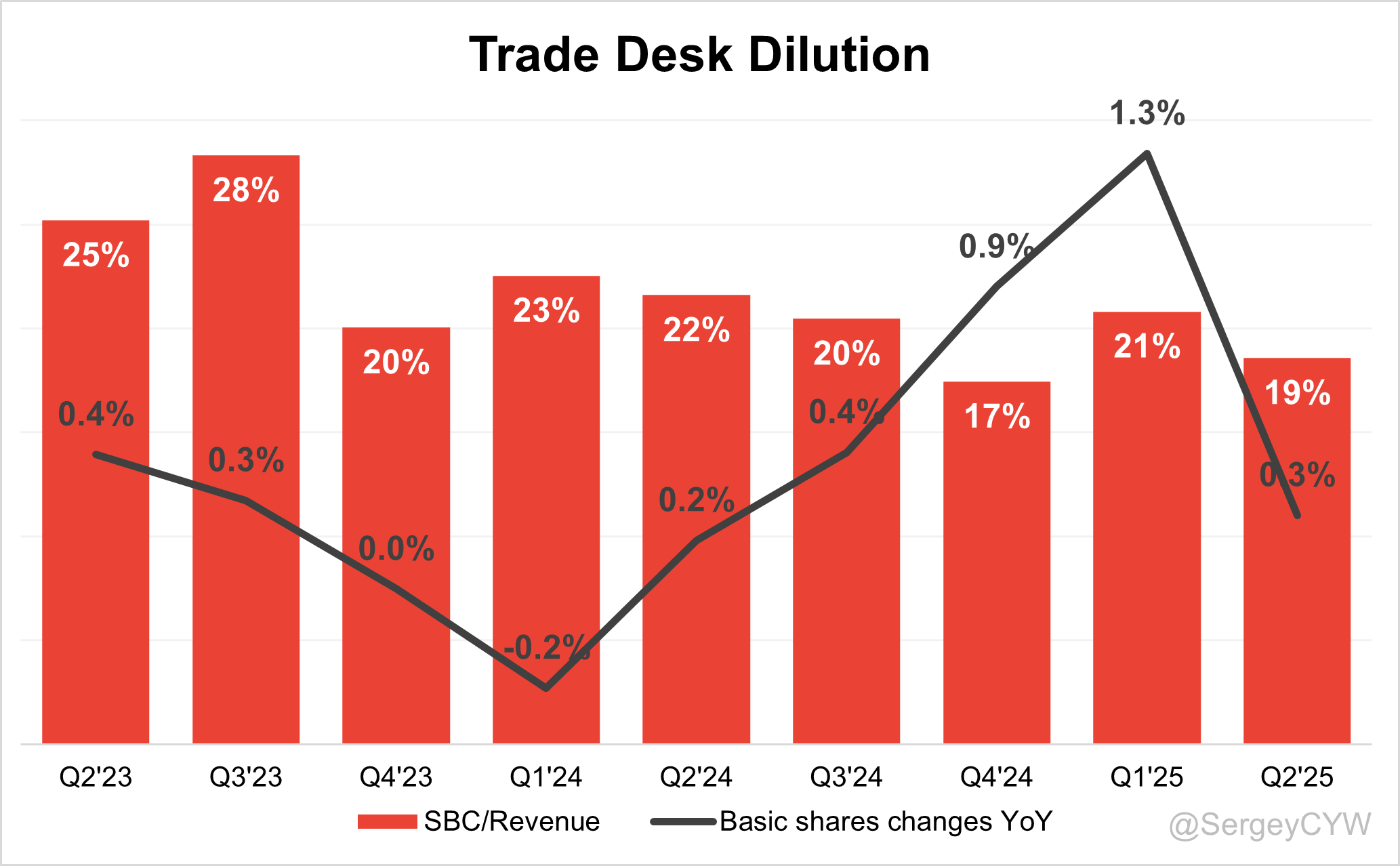 $TTD Shareholder Dilution: The Trade Desk’s stock-based compensation (SBC) expenses declined over the past year to 19% of revenue, which is in line with the SaaS company average.