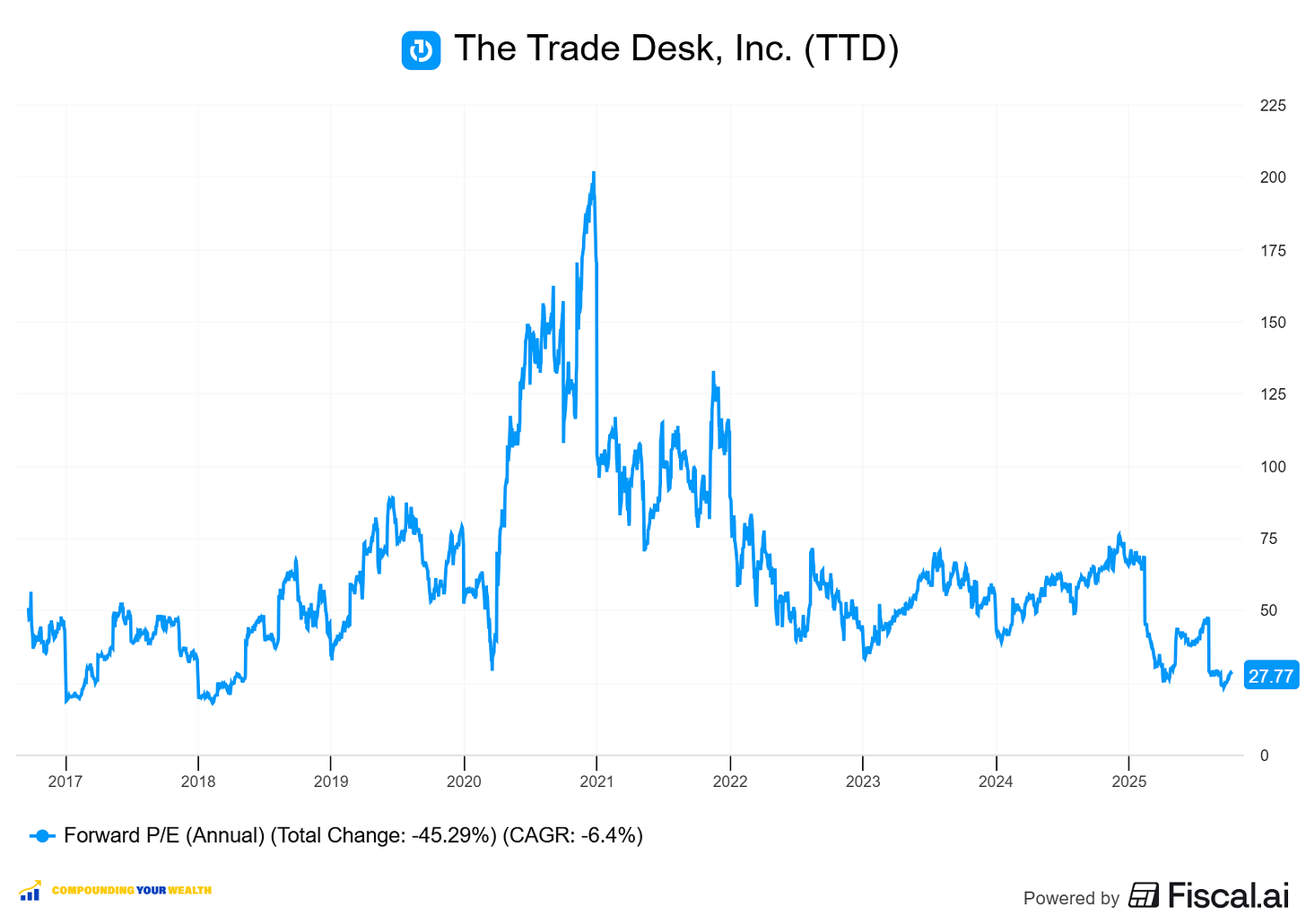 $TTD shares have dropped 62.4% from their 52-week high, significantly compressing valuation multiples. The stock still trades near historical lows and appears undervalued relative to other digital advertising companies, given the expected revenue growth.