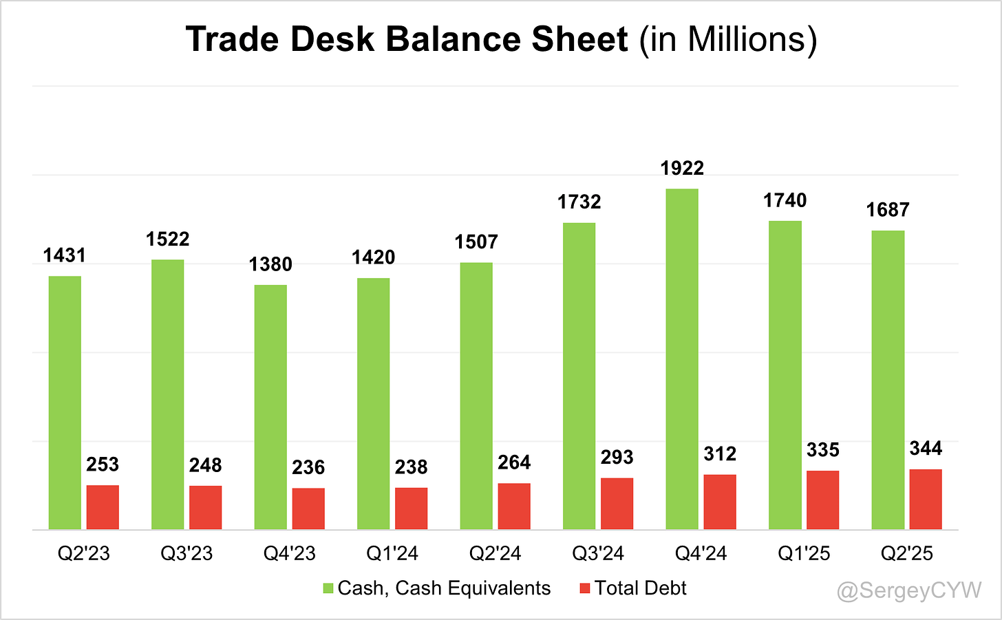 $TTD Balance Sheet: Total debt stands at $344M, while The Trade Desk holds $1,687M in cash and cash equivalents, exceeding total debt and ensuring a healthy balance sheet.