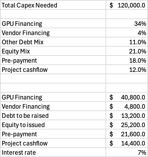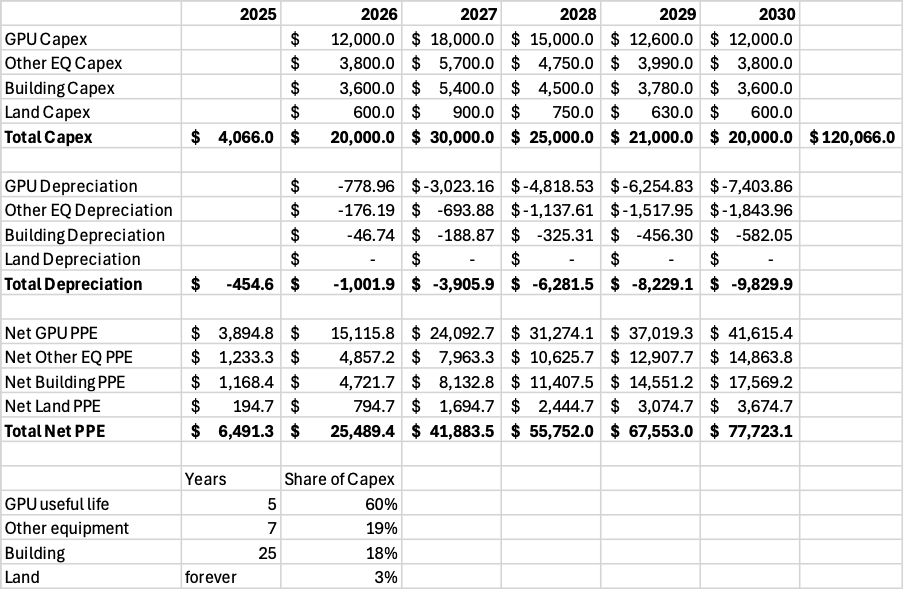 From total capex, I am modeling 60% going towards GPUs, 19% other equipment, 18% building, and 3% land.