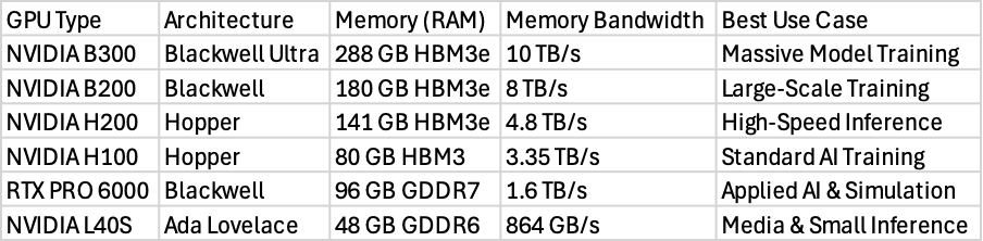 By offering many different types of GPUs, the platform allows users to choose the right balance between cost and performance. For example, the H100 is great for training, but the newer H200 or B200 models are better when the AI is actually being used by customers and needs to respond quickly.