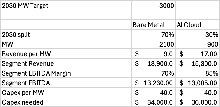 For bare metal, I am modeling $9M revenue per MW, whilst for AI cloud, I model $17M.