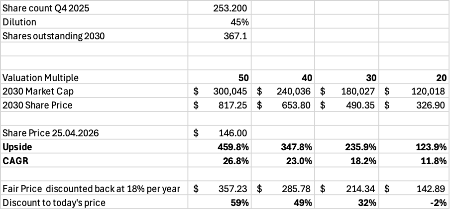 An exit multiple of 30, and we get a $490 stock, an upside of 236% from today’s price of $146.