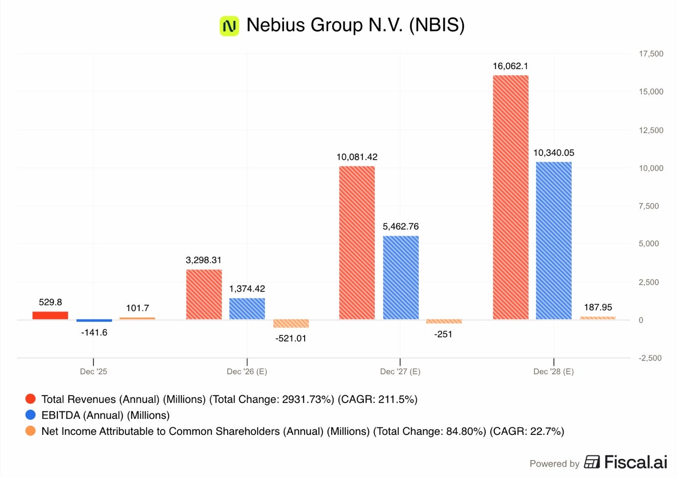 Taking these analyst consensus 2028 estimates into account, Nebius trades at 2.3x Sales and 3.6x EBITDA.